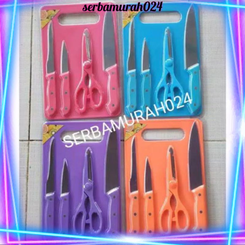 [ Amankan paket anda dengan peking kardus ada di etalase kami ]Set Talenan Dapur Lengkap Ready Pink, Biru, Ungu, Orange( Note : Dimohon menambahkan BABBLE WRAP biar paking aman, Apabila tidak ditambah BABBLE WRAB terjadi kerusakan bukan kesalahan dari lapak kami, dari kami sebelum dikirim sudah dicek dalam kondisi bagus siap kirim )1 Set Talenan Berisi :- 1 buah pisau besar untuk memotong daging - 1 buah pisau sedang untuk memotong sayur - 1 buah pisau roti - 1 buah gunting - 1 buah talenanSpesifikasi :Berat : 220 gramUkuran : 20cm*30cmBahan: Stainless Steel Dan PlastikPisau terbuat dari bahan stainless steel sehingga aman untuk bahan makanan dan lebih tajam. Talenan terbuat dari bahan plastik ABS yang berkualitas dan tidak licin.Untuk menjaga pisau tetap tajam dan lebih lama digunakan, sehabis memotong bahan makanan disarankan membersihkan menggunakan air panas dan kain