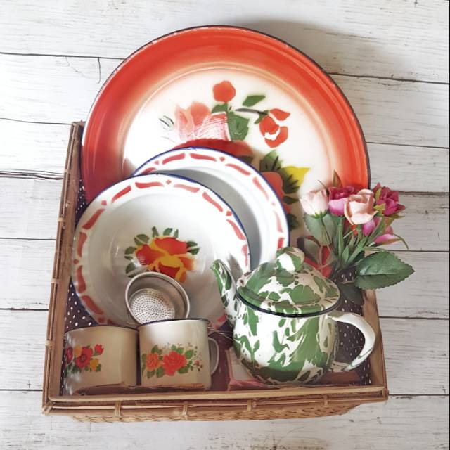 Name: Paket Parcel Silver A ( Nampan, Gelas,piring, Teko Enamel) Vintage