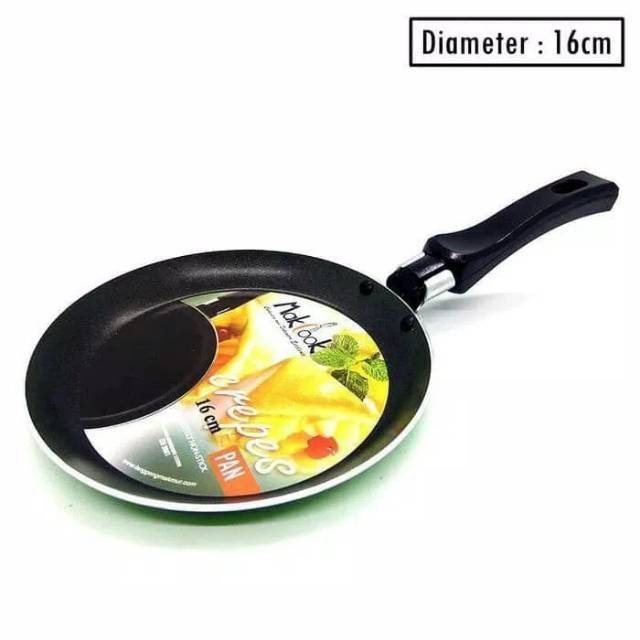 Kelebihan :- Terbuat dari bahan Alumunium DIlepisi teflon- Dapat digunakan untuk membuat crepes maupun pancake dengan bentuk bulat yang utuh,telur dadar, telur mata sapi, dan masakan lainnya- Gagang anti lengket & tahan panas- Dapat juga digunakan untuk menggoreng aneka jenis makanan dengan hanya memakai sedikit minyak sehingga makanan lebih sehat untuk dikonsumsiSpesifikasi Barang :- Diameter : 16 cm- Panjang teflon sampai gagang : 29 cm- Panjang gagang : 12.5 cm- Ketebalan : 0.8 - 2.0 mm- Bagian bottom berwarna : Hijau- Handle : Anti