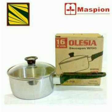 Deskripsi Maspion OLESIA Sauce Pan Panci Stainless Steel 16 cmMaspion panci olesia 16cm terbuat dari bahan Stainles steel berkualitas tinggi,anti karat dan tahan lama. Dilengkapi dengan tutup kaca yang memudahkan anda dalam memasak tanpa harus membuka-tutup panci terus menerus Gagang kuat dan anti p