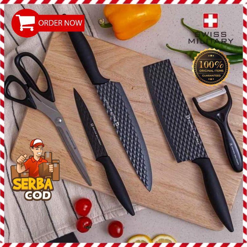 Pisau Original Swiss Military set of 5Material Stainless Steel yang awet dan tidak mudah karat.Swiss Military set tediri dari:- Pisau Cleaver 8 inci (pisau daging)- Pisau Multifungsi- Pisau Buah- Gunting- PeelerKeunggulan produk:1. Paket pisau komplit untuk segala kebutuhan dapur Anda2. Terbuat dari material stainless steel berkualitas dengancoating tahan lengket (non-stick)3. Kuat, tajam, dan tahan lama4. Dengan desain eksklusif yang unik dan dapat mengirismakanan dengan mudah.5. Gagang pisau anti-slip yang aman dan nyaman digenggam6. Desain gagang membantu hasil potong lebih