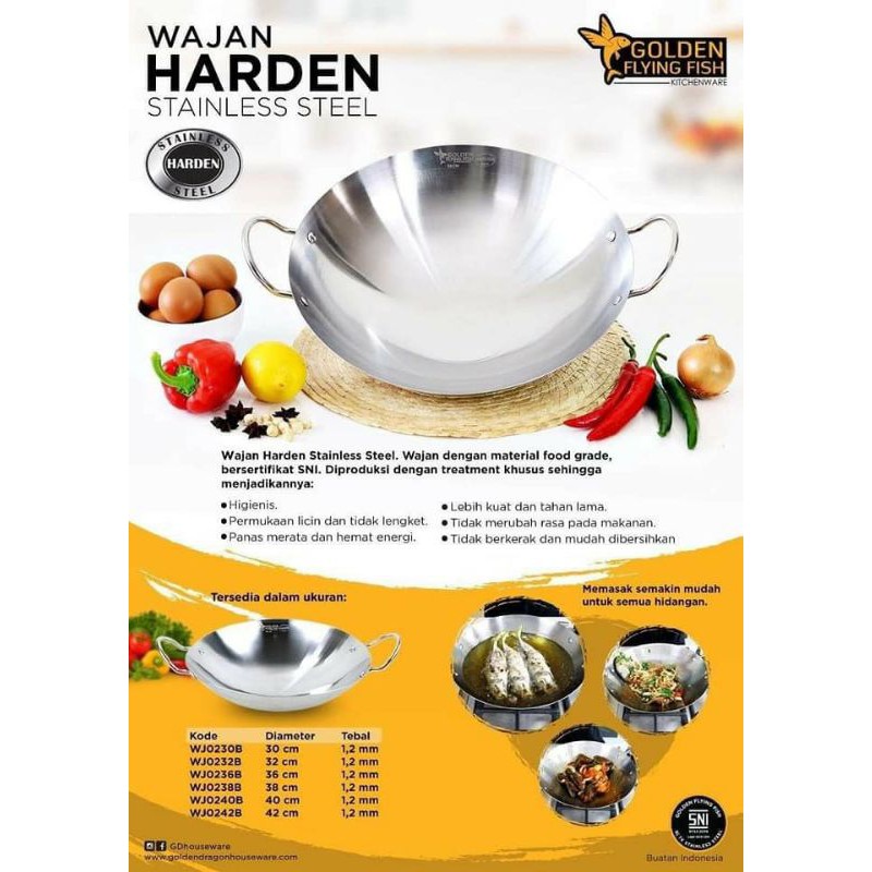 Wajan Anti Lengket-Uda ga ada lagi cerita wajan stainless yang lengket waktu dipake. Sekarang Golden Flying Fish keluarin Wajan Stainless Harden yang anti lengket! Lebih mudah dipakai dibanding stainless biasa, lebih mudah dibersihkan & yang pasti bakal lebih awet lagi.Ukurannya juga banyak.....mulai dari ukuran 30 cm sampai 42 cmGolden Flying Fish Wajan Wok Stainless Steel (Wajan harden stainless steel) merupakan peralatan masak stainless steel berkualitas. Diproduksi di Indonesia dengan material stainless steel food grade dan bersertifikat SNI (Standar Nasional Indonesia) yang merupakan material yang aman karena tidak menimbulkan reaksi kimia saat digunakan untuk memasak. Produk ini telah melewati proses harde treatment saat proses produksi agar tidak lengket saat digunakan untuk menggoreng (namun harus tetap menggunakan minyak). Produk ini telah mendapatkan Sertifikat SNI 8752:2019.Kelebihan Wajan Wok Stainless Steel Golden Flying Fish:– Food grade– Bersertifikat SNI 8752:2019 (Standar Nasional Indonesia)– Tidak lengket. Panas lebih merata dan hemat energi– Higienis dan mudah dibersihkan– Lebih tebal, kuat, dan tahan lama. Tidak rontok saat proses memasak– Tidak mengubah rasa atau menimbulkan reaksi kimia pada makanan yang dim