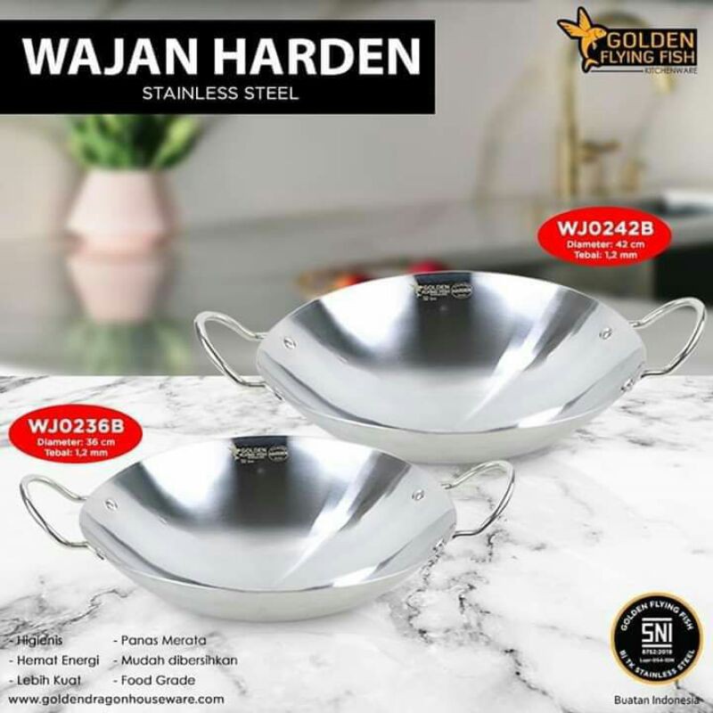 Agar makanan yang sedang anda goreng tidak lengket (telur goreng, ikan goreng, tahu goreng, bihun goreng), gunakan wajan harden stainless steel. Produk peralatan masak stainless steel terbaru dari Golden Flying Fish yang memiliki lapisan coating khusus inovasi terbaru, sehingga tidak lengket saat digunakan. Wajan lebih mudah dibersihkan sehingga bebas dari segala macam bakteri dan virus (higienis), lebih kuat, panas cepat didistribusikan secara merata sehingga proses memasak lebih hemat energi. Anda cukup menggunakan api kecil saja, sehingga anda dapat menghemat penggunaan gas. Wajan harden stainless steel juga sangat nyaman digunakan karena pegangan atau handle wajan tidak panas saat sedang digunakan.Wajan harden stainless steel Golden Flying Fish diproduksi dengan menggunakan bahan baku stainless steel foodgrade, bersertifikat SNI. Merupakan peralatan masak stainless steel pertama di Indonesia yang mendapatkan sertifikat SNI (Standar Nasional Indonesia) untuk kategori peralatan masak stainless steel.Tersedia dalam 6 ukuran berbeda (diameter 30 cm, 32 cm, 36 cm, 38 cm, 40 cm, 42 cm) untuk menyesuaikan kebutuhan dan kenyamanan anda dalam memasak.CATATAN : * Barang yang kami kirim selalu melalui proses QC (Quality Control) * Kerusakan yg diakibatkan jasa pengiriman diluar tanggung jawab kami * Harap bisa dimengerti Happy shopiiiiing di #Arsya_AL_Shop Terima