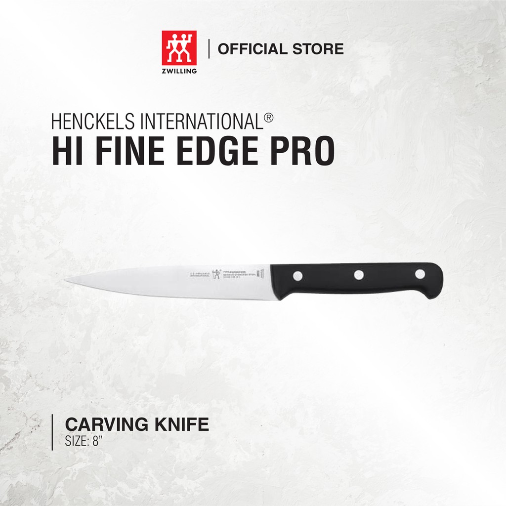Pisau Hi Fine Edge Pro V Pisau Pisau UkirPanjang bilah: 7 inciHenckels International Fine Edge Pro 8" Carving Knife memudahkan untuk mengukir dan menyajikan daging dengan indah. Diasah untuk ketajaman yang tahan lama, pisau bermata halus menawarkan pemotongan yang presisi. Ukir kalkun panggang dengan percaya diri, iris ham dengan halus, dan potong iga menjadi irisan yang lezat.Dibuat dari baja tahan karat berkualitas tinggi yang tahan lama, konstruksi bilah tunggal Fine Edge Pro yang dicap lebih ringan daripada pisau tempa. Seiring dengan tang penuh, ini mendorong kemampuan manuver maksimum. Melengkung untuk kenyamanan, pegangan triple-rivet tradisional mendukung pemotongan tanpa lelah. Setiap kali Anda memasak, Anda pasti ingin meraih set pisau yang berguna ini.Dibuat dari baja tahan karat berkualitas tinggiKonstruksi blade satu bagian dan dicap presisi memberikan daya tahanPisau profesional dengan sentuhan satin menawarkan pemotongan presisi dan diasah dengan halus untuk ketajaman yang tahan lamaRingan, desain tang penuh menghasilkan kemampuan manuver maksimumPegangan triple-rivet tradisional menawarkan keseimbangan dan kenyamananAman untuk mesin cuci p