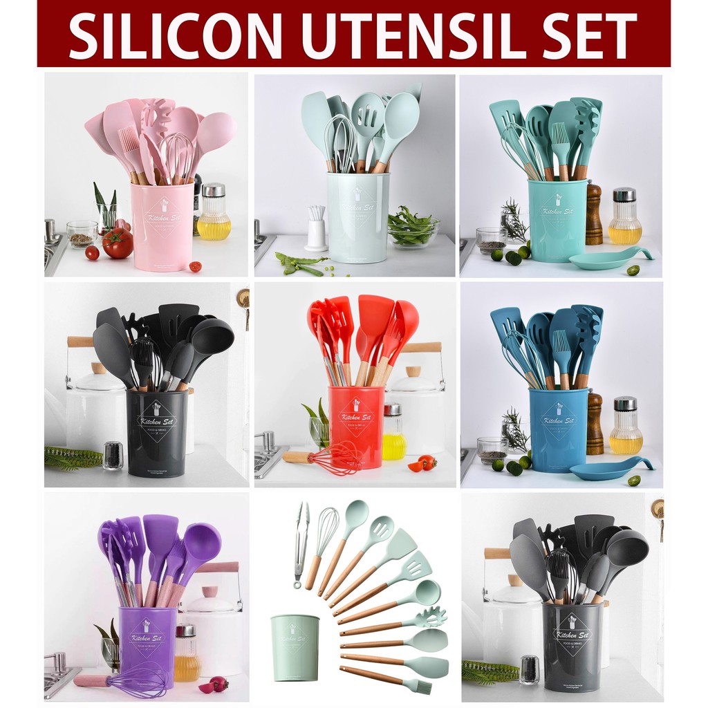 ✅ Ready stock & Langsung Dikirim✅ Pembayaran COD di Tempat✅ Melayani Kurir Instan & Kargo✅ Melayani Dropship/Reseller melalui Shopee / Resi Otomatis Silahkan Chat☑️Kualitas barang original 100% Original 12in1 = 11 pcs utensil set + tempat/wadahnya13in1 = 11 pcs utensil set + tatakan spatula + tempat/wadahnya☑️Termurah dari semua marketplace dengan kualitas original 100%!!! (Direct Supplier)☑️PRODUK KAMI 100% ORIGINAL!!☑️WASPADA PRODUK PALSU!!!CIRI-CIRI PRODUK PALSU: Box berbeda, Logo pada wadah berbeda (Bukan bertuliskan kitchen set atau duplikat tetapi tidak serupa) atau tidak ada logo, warna berbeda dari original 9 warna sesuai dengan yang kami miliki, pemakaian tidak awet, dan kualitas jauh berbeda.☑️Keterangan:Perangkat ini memiliki semua yang Anda butuhkan untuk mengambil, menumis, dan menyiapkan makanan atau kue! Ini adalah hadiah pindah rumah yang sempurna atau bahkan upgrade dapur untuk Anda sendiri karena set ini praktis dan bermanfaat untuk penggunaan sehari-hari. Terbuat dari gel silika food grade tahan lama, peralatan ini sangat kuat dan aman untuk digunakan.☑️Fitur & Kelebihan:> Set peralatan non-stick / anti lengket> Pegangan panjang untuk mencegah panas> Dilengkapi dengan 11 peralatan berbeda & wadah penyimpanan > Terdiri dari: Kocokan, Kuas Minyak, Penjepit Makanan, Sendok Sup, Spatula Kue, Sendok Spaghetti, Sendok Menumis, Scoop Datar, Saringan, Spatula, Sendok Datar> Food Grade (FDA APPROVED)☑️Bahan:Food grade silica gelStainless steelKayu☑️Panduan perawatan:> Cuci dengan air sabun hangat sebelum digunakan pertama kali> Suhu maksimal 230º Celcius, suhu terendah -40º Ce