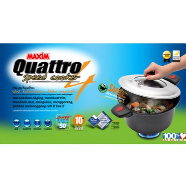Deskripsi Maxim Quattro PanciMembuat kukusan kue atau daging menjadi lebih cepat dan mudah dengan menggunakan Maxim Quattro Pressure Cooker QUATTRO-24PC.Memiliki lapisan anti gores dan anti lengket serta terbuat dari bahan teflon berkualitas dan dapat menghantarkan panas dengan tepat pada makanan yang sedang anda kukus. Membuat masakan anda menjadi semakin lezat, lembut dan nikmat.Fitur dan keunggulan Maxim Quattro Pressure Cooker QUATTRO 24PC Multi Purpose1. Menghemat energy. Dengan Maxim Quattro Pressure Cooker QUATTRO-24PC, anda dapat menghemat waktu memasak anda sampai dengna 50%2. Mudah penggunaannya. Maxim Quattro Pressure Cooker QUATTRO-24PC Diciptakan untuk mempermudah proses memasak dan mengolah berbagai bahan masakan. Produk Maxim Quattro Pressure Cooker QUATTRO-24PC ini memungkinkan anda untuk membuat tutup bahkan ketika proses dengan tekanan sedang bekerja di dalamnya. Katup Pengatur Tekanan bekerja untuk menyeimbangkan tekanan dan membuat tekanan yang berlebih3. Mempertahankan rasa dan panas lebih lama. Karena Maxim Quattro Pressure Cooker QUATTRO-24PC mempunyai keunggulan pada tutup yang rapat seperti presto pada umumnya, panas, rasa, serta vitamin masakan dapat dipertahankan selama mungkin.4. Tutup yang sebagian terbuat dari Kaca. Maxim Quattro Pressure Cooker QUATTRO-24PC mempunyai sistem tutup yang unik dan sangat elegan. Dengan perpaduan Tutup dengan Finish Soft Anodise + bagian tengah terbuat dari kaca tembus pandang, sehingga kita dapat mengontrol tingkat kematangan dan mengawasi proses memasak dari luar5. Lapisan anti lengket, Mudah untuk dibersihkan dan lebih sehat karena dapat menggunakan minyak sedikit/tanpa minyak sekalipun6. Eksterior dan bentuk yang elegan7. Multi Fungsi, Memasak dan melunakkan daging, mengukus dengan tekanan, membuat sup, nasi, bubur, roti, dengan waktu yang jauh lebih cepat.8. Pegangan anti-slip, dilengkapi dengan tambahan Silikon untuk memastikan kenyamana